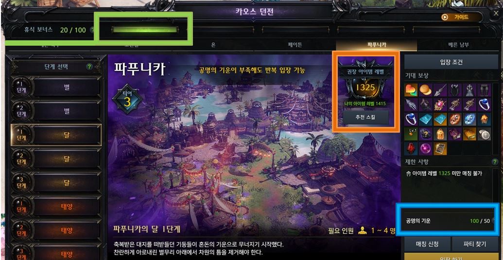 휴식 보너스의 개념은 간단합니다. 가디언 토벌이나 쿠르잔 전선 같은 일일 콘텐츠를 건너뛰면, 그에 해당하는 휴식 게이지가 자동으로 쌓입니다. 이후 휴식 게이지가 쌓인 상태에서 콘텐츠를 클리어하면 평소보다 훨씬 많은 보상을 한 번에 얻을 수 있어, 며칠 쉬더라도 손실을 최소화할 수 있습니다.